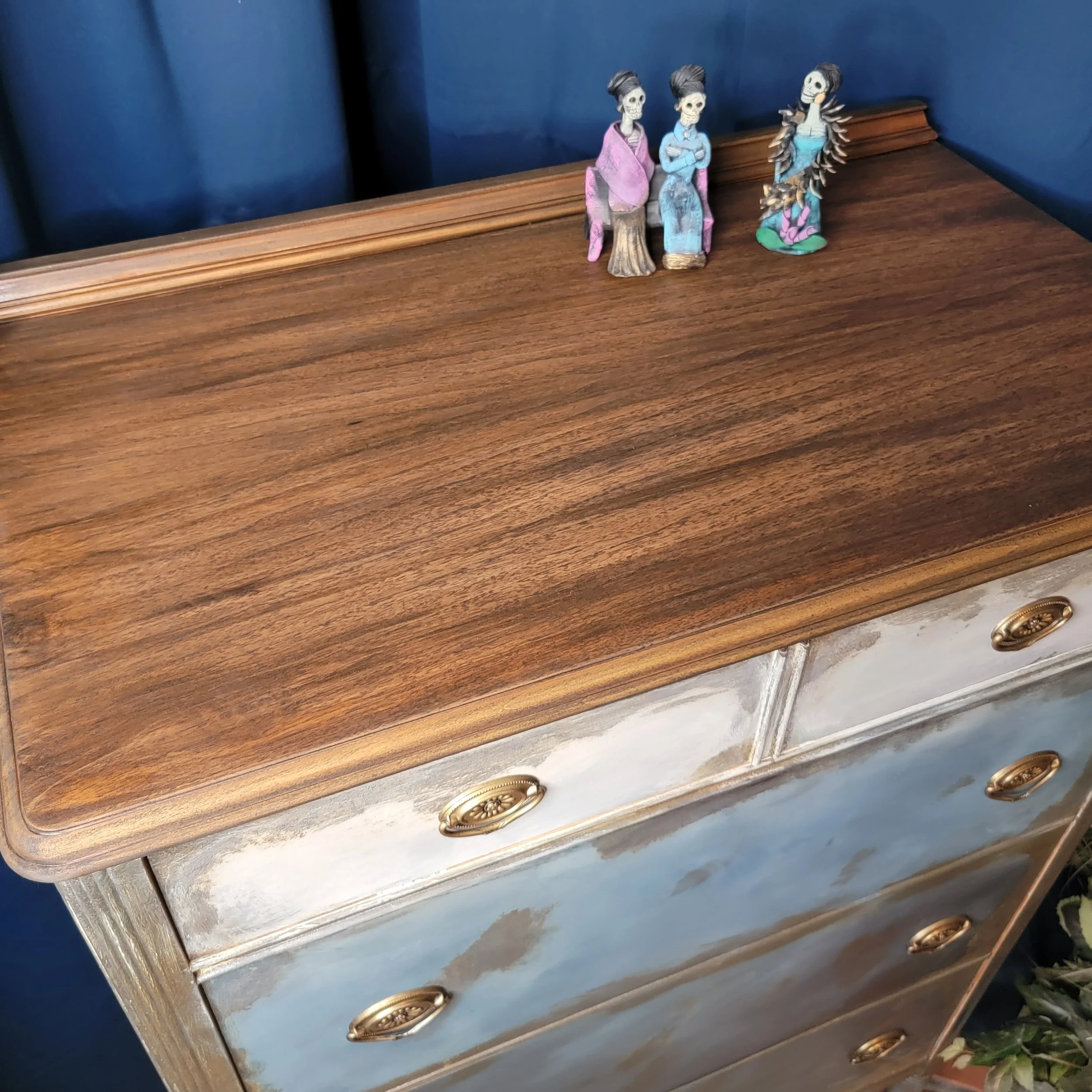 My goal for this project was to learn how to use Dixie Belle patina paints to make this dresser look like it has rust around the edges. I don’t know if I achieved that look but I love the way it turned out.